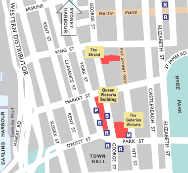 As for train stations, you can get off at town hall station and walk towards one end of the station where theres a fork through to QVB and the Galeries Victoria. Otherwise, you can go above ground and look for it there. If you go through station into the Galeries Victoria, go up the escalators on your right as you approach the basement food court and after you're up, turn left and follow the escalators up to the top floor.